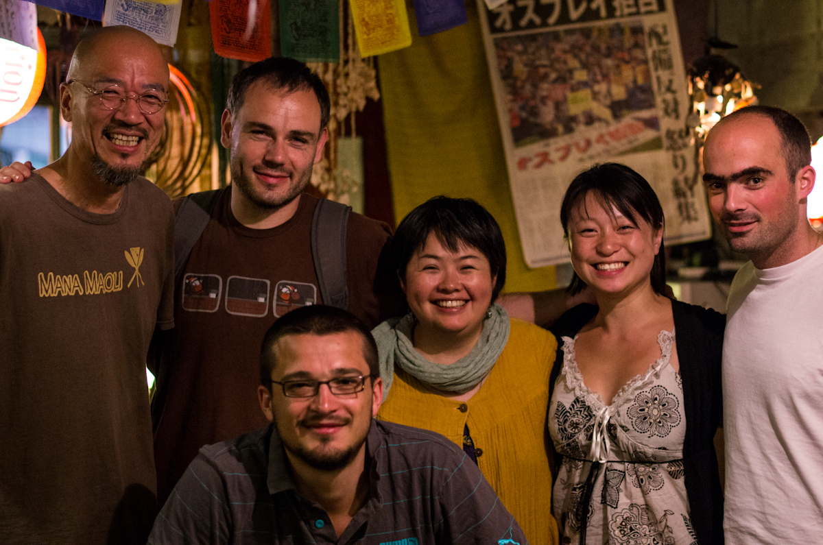 13 minutes plus tard, nous arrivons à Osaka. Ou Shin-Osaka, on se sait plus bien. Quelques stations de métro plus tard, Pierrot prend le leadership. Nous faisons 300 mètres et revenons sur nos pas. Un vieux japonais nous indique une rue, quelques mètres plus tard nous faisons la connaissance de Noco, notre cher hôte tenant de bar. Encore une fois, nous ne sommes pas déçu par notre hébergement. On pose nos affaires, et direction le restaurant. Anniversaire d’Yifan oblige, il est chinois. Elle peut échanger quelques mots en mandarin. C’est cadeau.