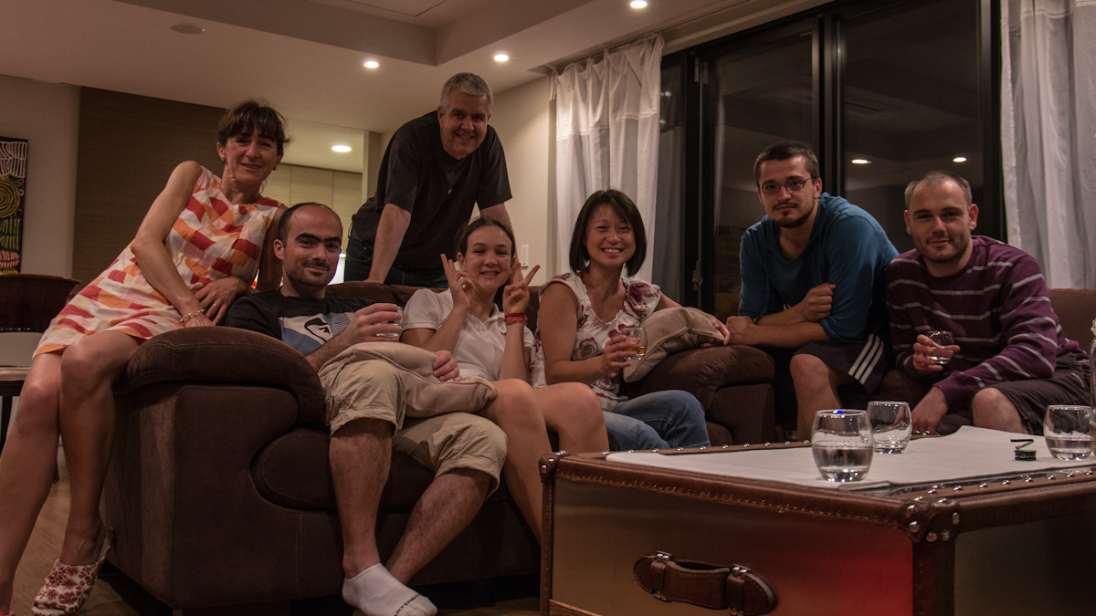 On tourne, on tourne, on tourne. La soif arrive. Et nous avons deux heures avant notre rendez-vous chez les cousins de Pierrot, Alex & Sophie. On se dirige vers leurs stations pour s’arrêter dans un bar. Quelques rafraîchissements plus tard, nous nous retrouvons coincé en bas de leur immeuble sans le digicode et sans comprendre comment les appeler. Une loose de plus. Heureusement, Alex rentre du travail quasiment au même moment. Facile. S’ensuit un apéritif, y’a pas, la famille Bergerolle sait recevoir. Direction le restaurant, nous sommes attendu à 20h30 et les japonais ne rigolent pas avec l’horaire. Salle privé dans un décors typiques. On est pas mal ! Le repas est excellent, assurément le meilleur que nous ayons mangé au Japon. Fin du repas, en lisant le blog, les cousins avaient prévu un gâteau d’anniversaire pour Yifan ! Un happy birthday, et un fraisier dans le ventre, nous repartons pour un dernier verre à leur appartement.