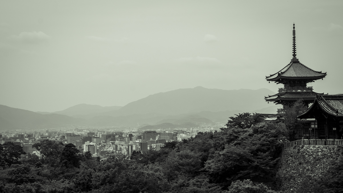 10h30, retour d’Yifan. Le magasin n’ouvrait qu’à 10h00. Loose. P’tit Dej et direction le temple de Kiyomizu-dera, pas très loin de l’appartement. Première journée couverte, cinquième journée sans lumière. Bizarrement, on trouve le temple assez rapidement, certainement parce qu’il est the place to be de toutes les classes scolaires de Kyoto (ou d’ailleurs). C’est dans un nuage de mômes parsemés de touristes que nous commençons la visite. Le temple surplombe Kyoto, la vue est plutôt sympa.