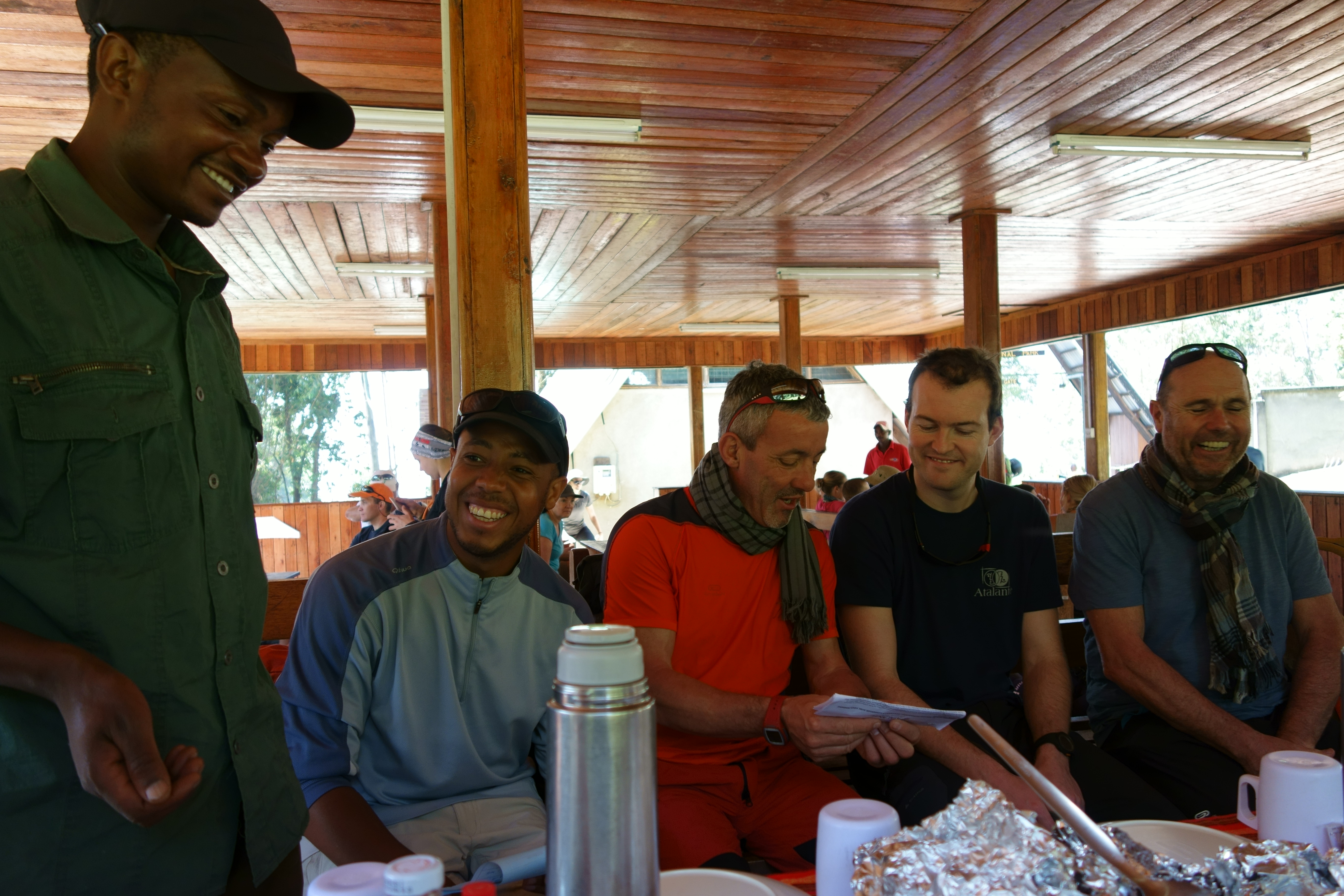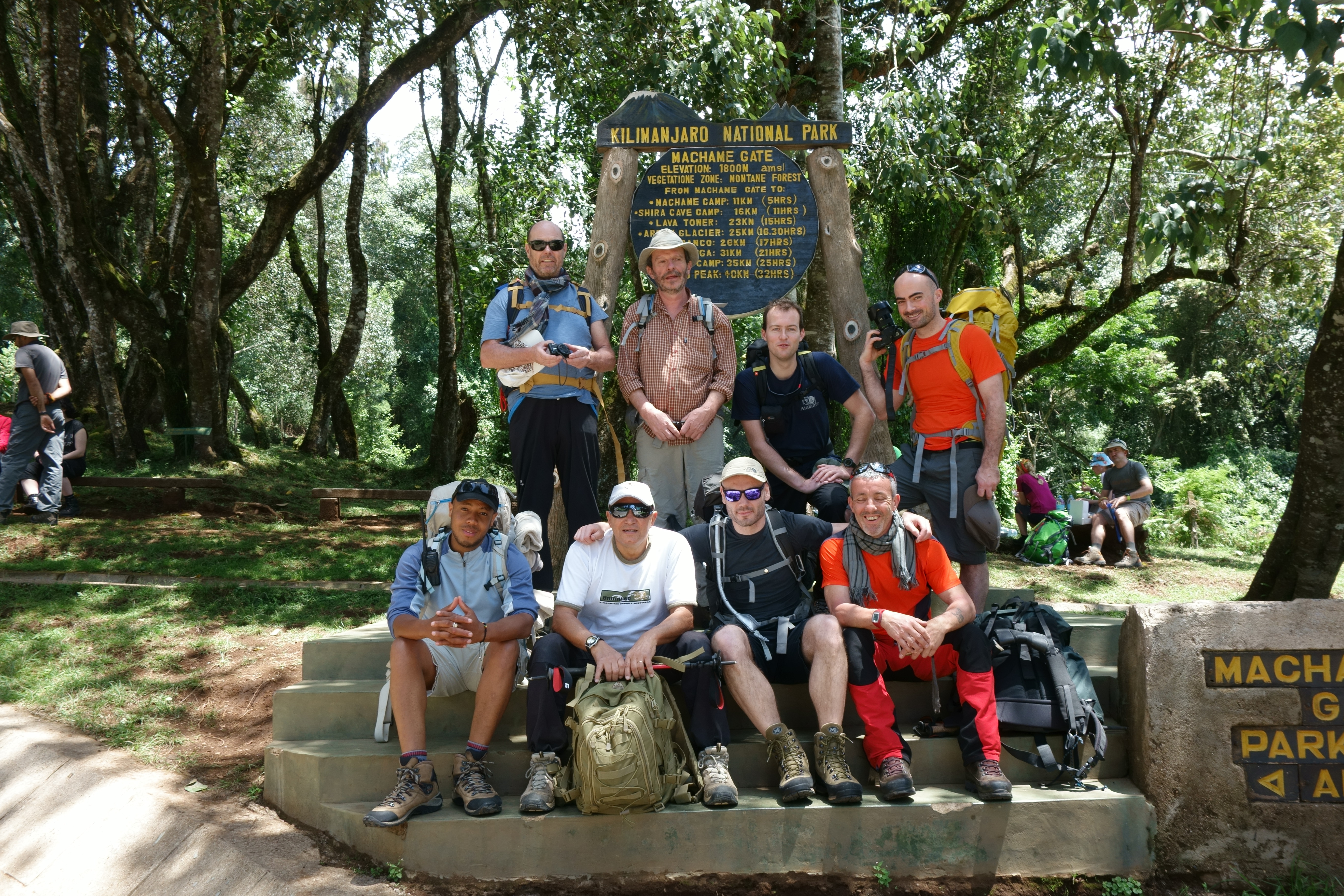 10h30 : Arrivés à la Machamé Gate. On procède à notre enregistrement pour entrer dans le parc. Puis on prend un repas avant d’entamer notre périple. On nous présente notre staff : 3 guides Edou, Nestory, Simon, un cuisinier, un serveur, 26 porteurs.