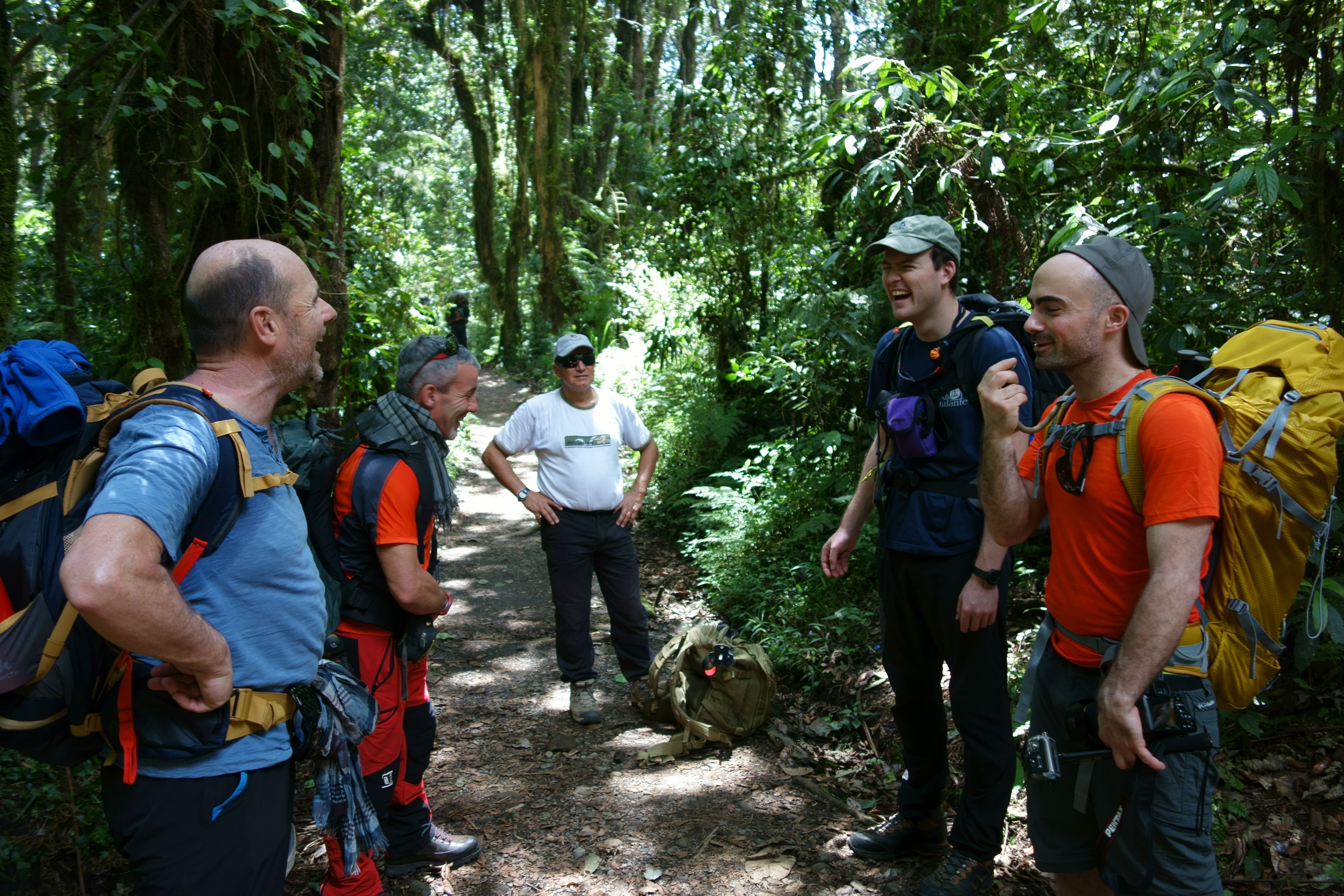 12h03: On franchit enfin la porte Machamé. L’ascension commence sous le soleil. Il fait beau, nous sommes à l’ombre de la forêt tropicale. Nestory notre guide francophone nous rappelle la règle d’or de la marche en montagne : Polé Polé (doucement doucement). On a du mal à tenir le pas polé polé, nous avons tellement attendu ce moment que nous marchons à bon rythme.