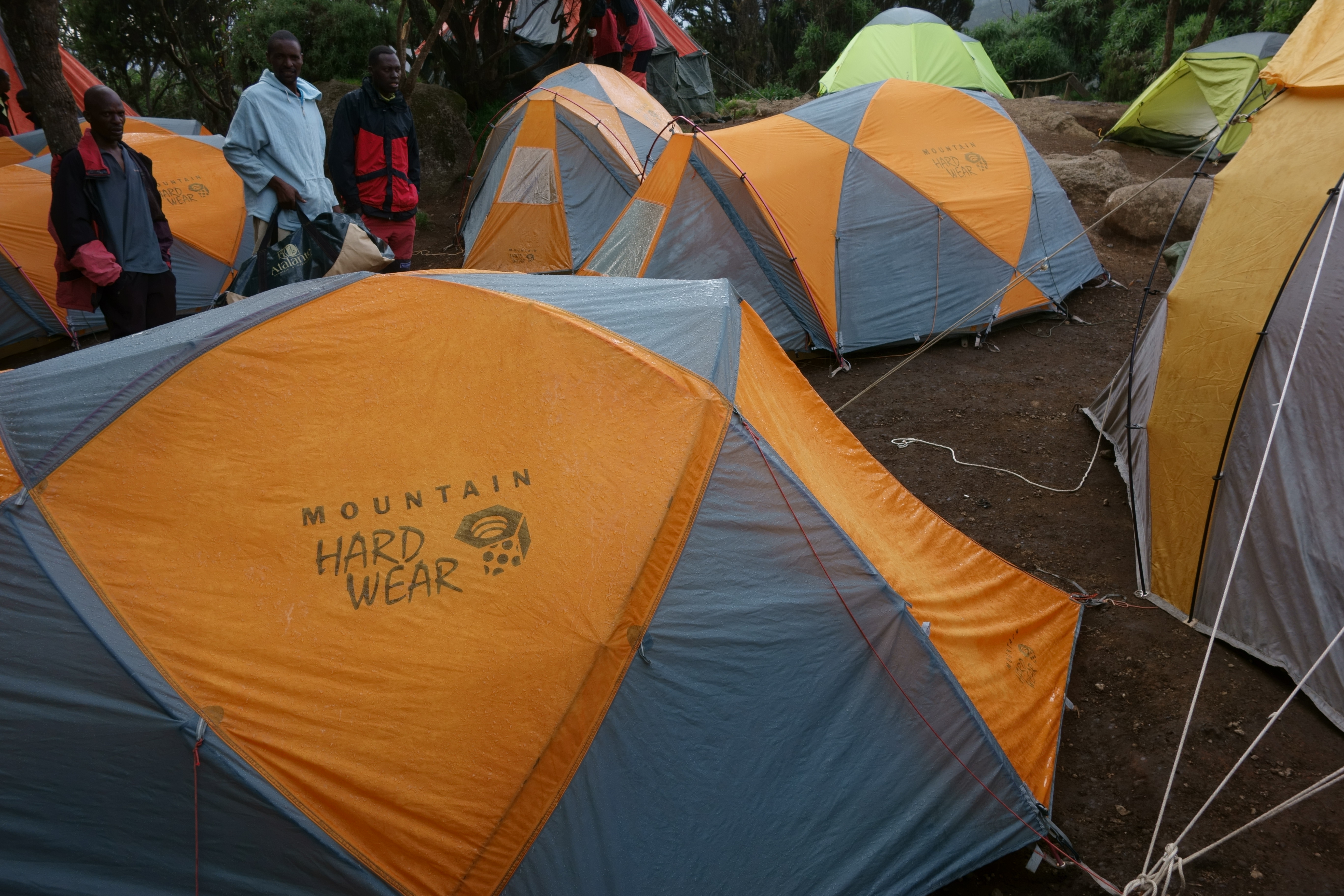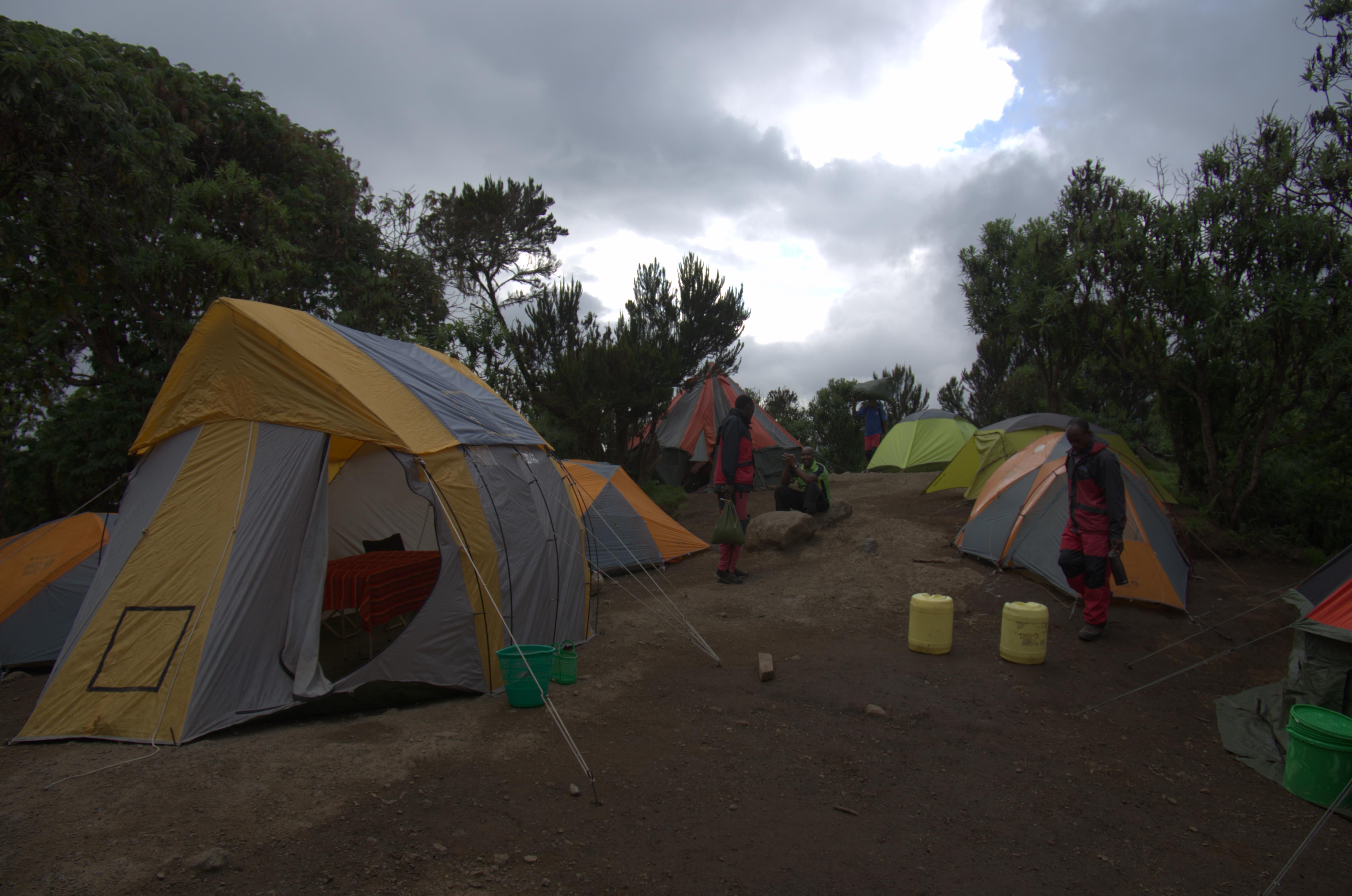 4h30 plus tard et 1200m de dénivelé avalés, on arrive à 3100m au premier camp sous la pluie. Bien que nous ne soyons pas en haute saison, il doit y avoir plusieurs dizaines de tente. Tous les randonneurs passant par la voie Machamé doivent faire escale ici pour leur première nuit.