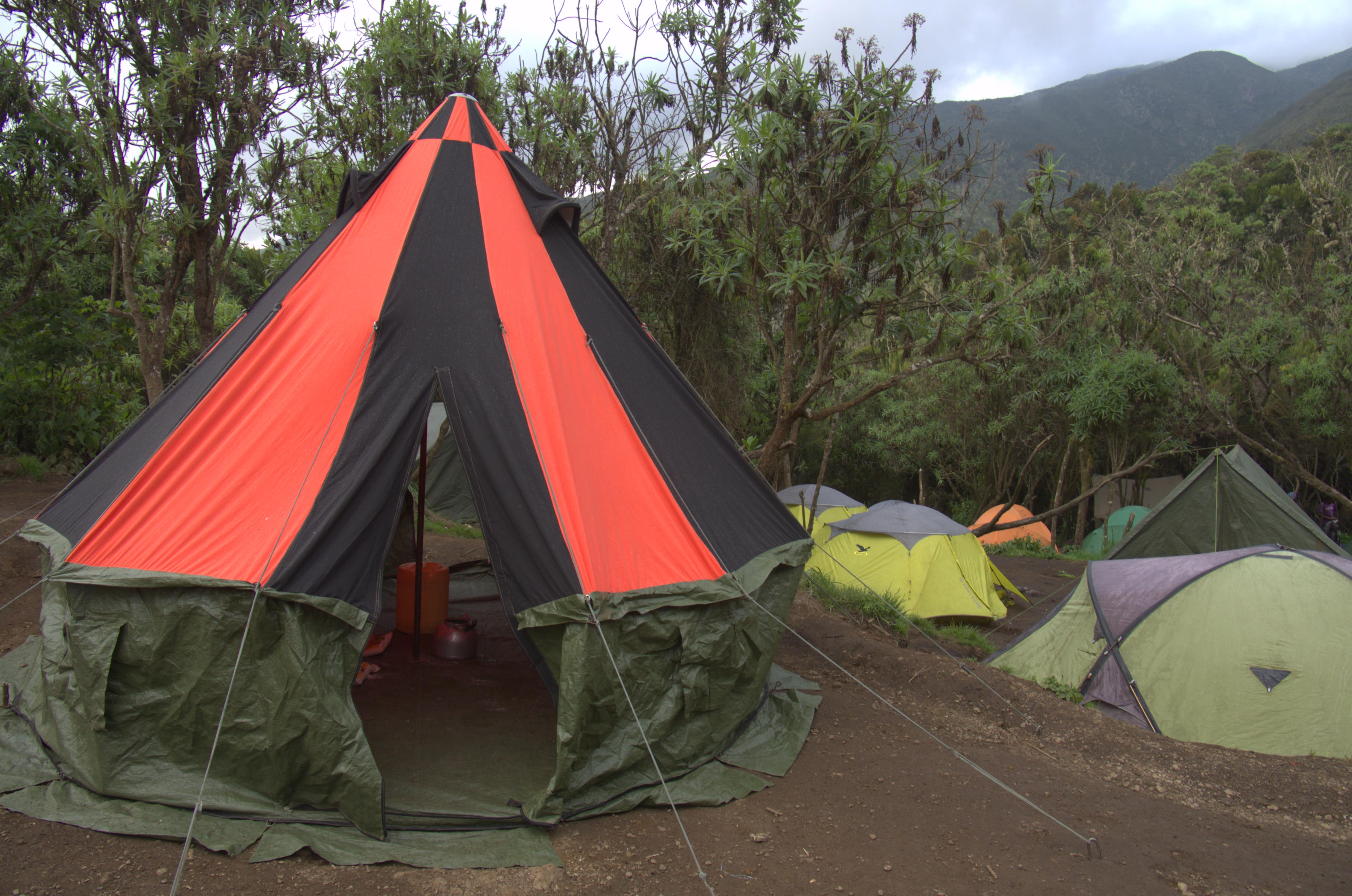 1 tente mess, 1 tente cuisine, 1 tente pour les porteurs, 6 tentes pour nous, 1 tente salle de bain. On sera deux personnes dans des tentes de 3.