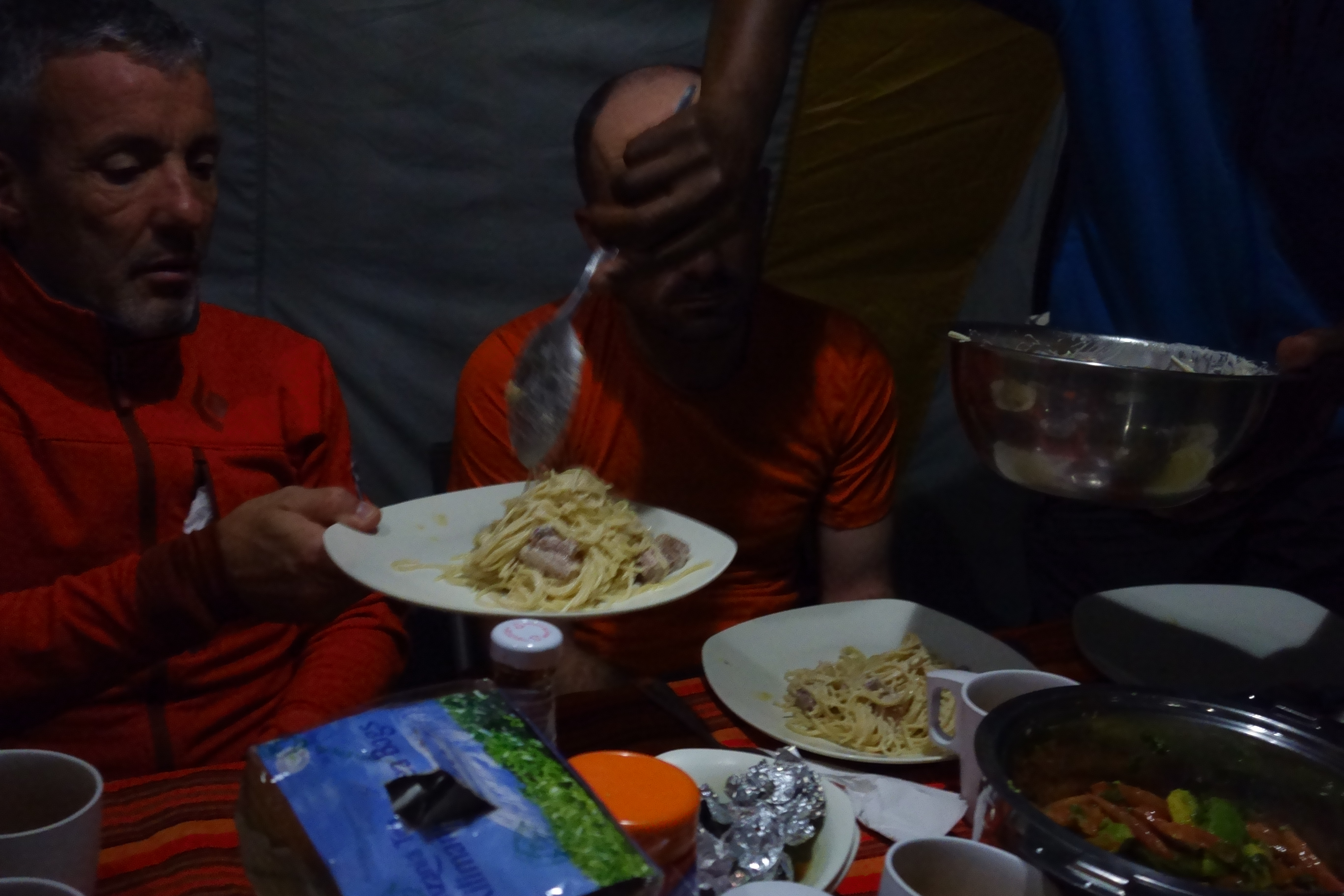 20h00 : Premier repas sur le camp. Soupe de légumes, pâtes à la carbonara (WTF !!) et bananes. C’est très bon. On comprend que les repas sont un facteur important de la réussite de l’ascension.