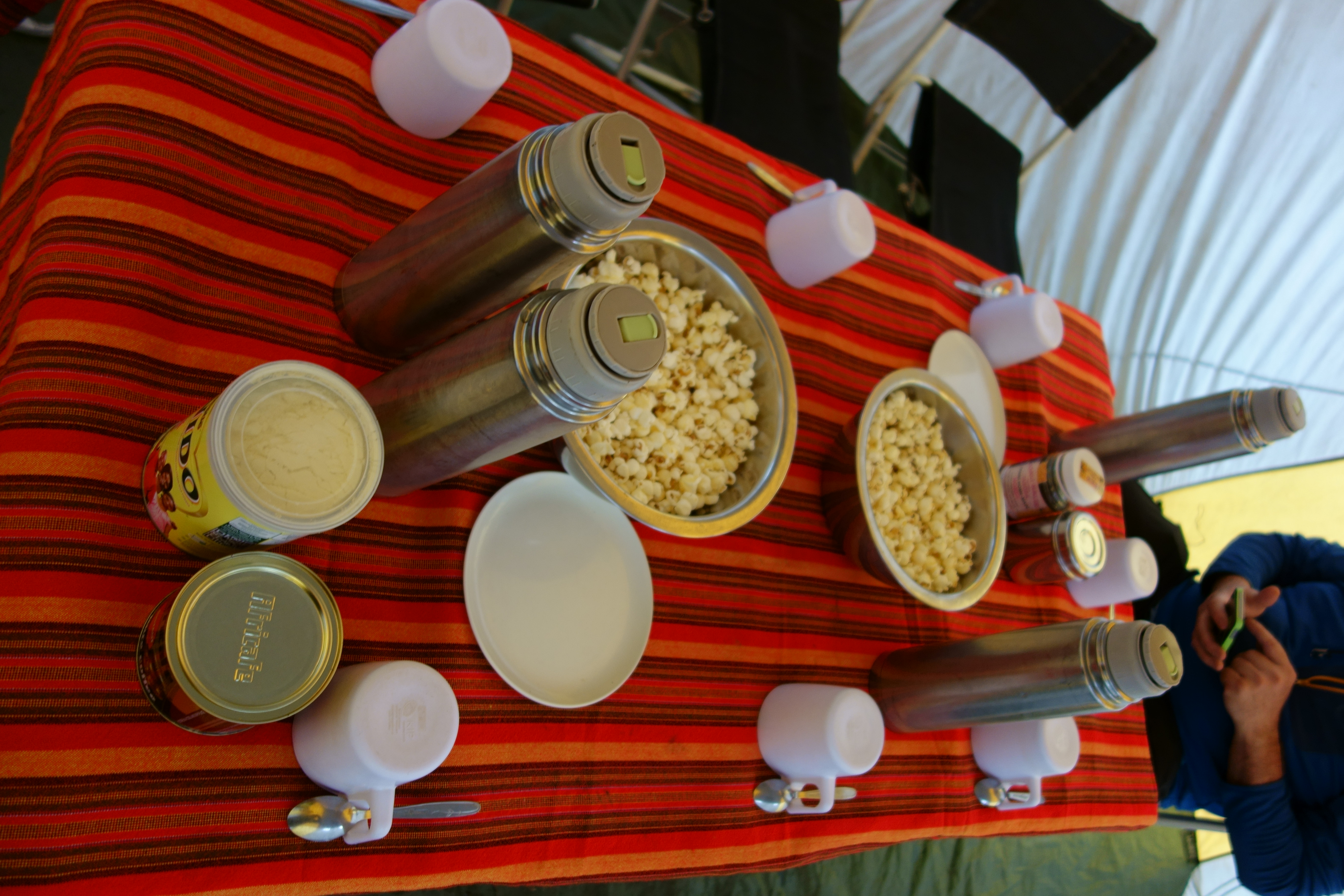 Une fois le tour du propriétaire effectué, on a le droit à un goûter dans la tente mess Popcorn, thé, café.