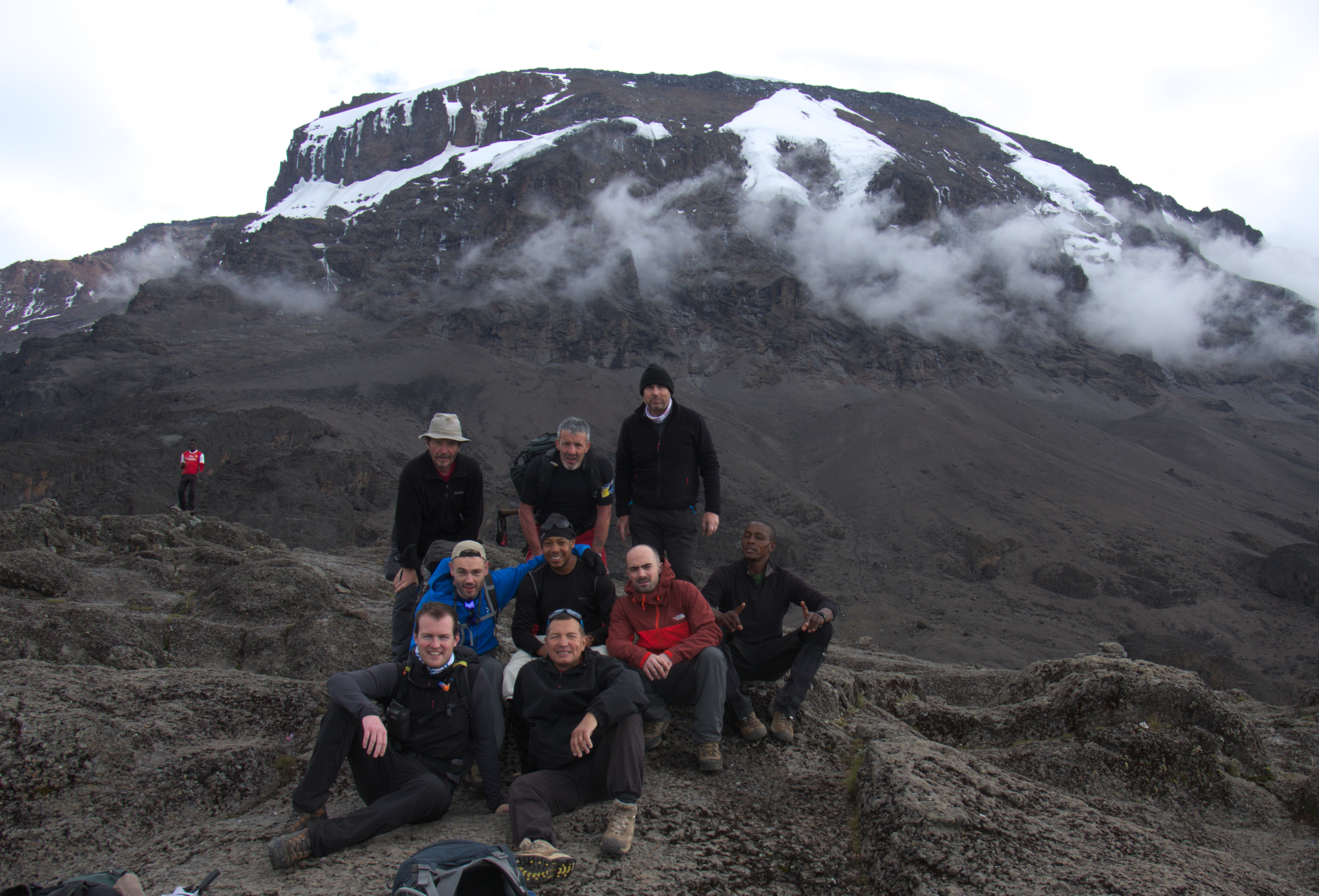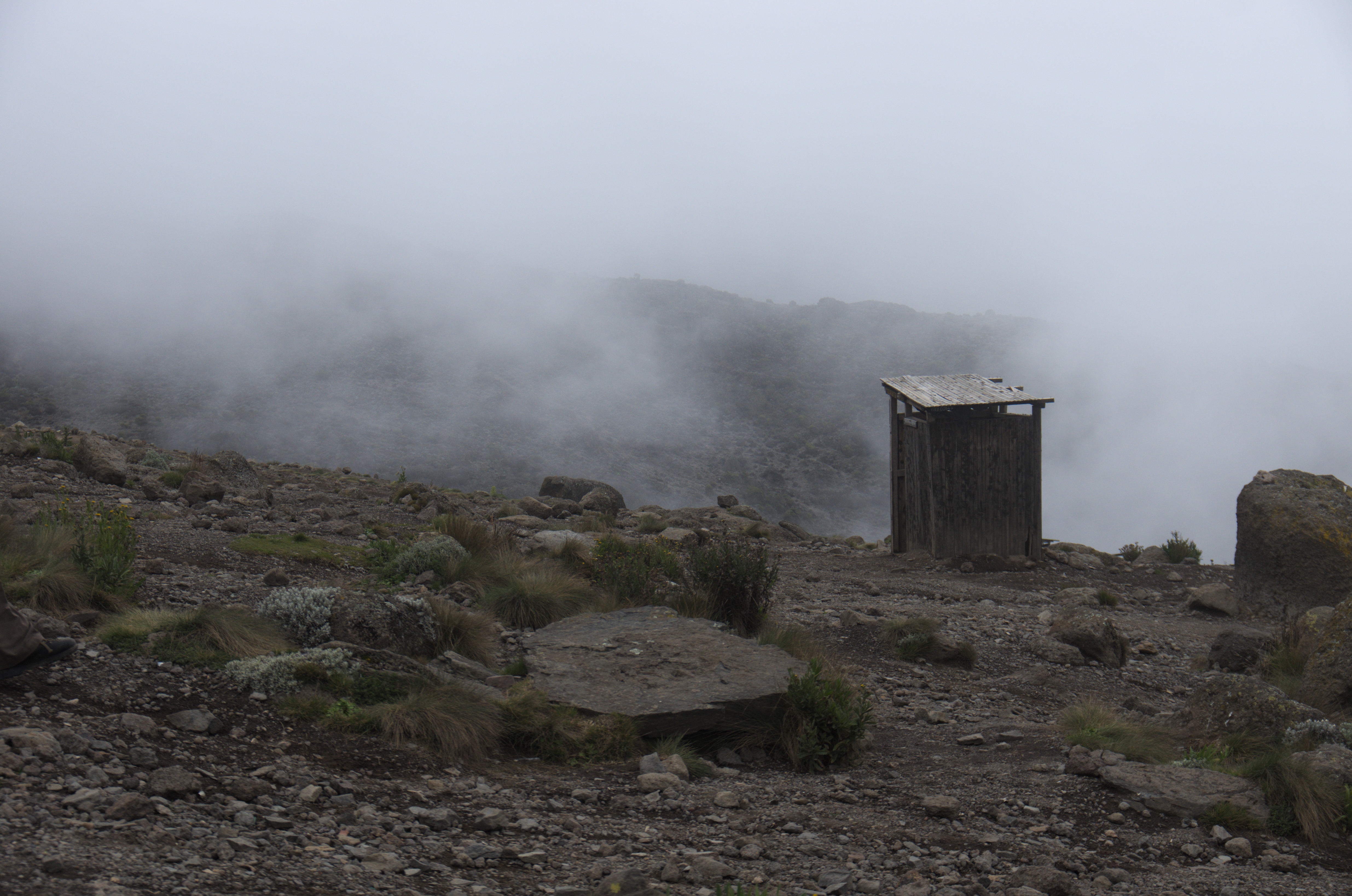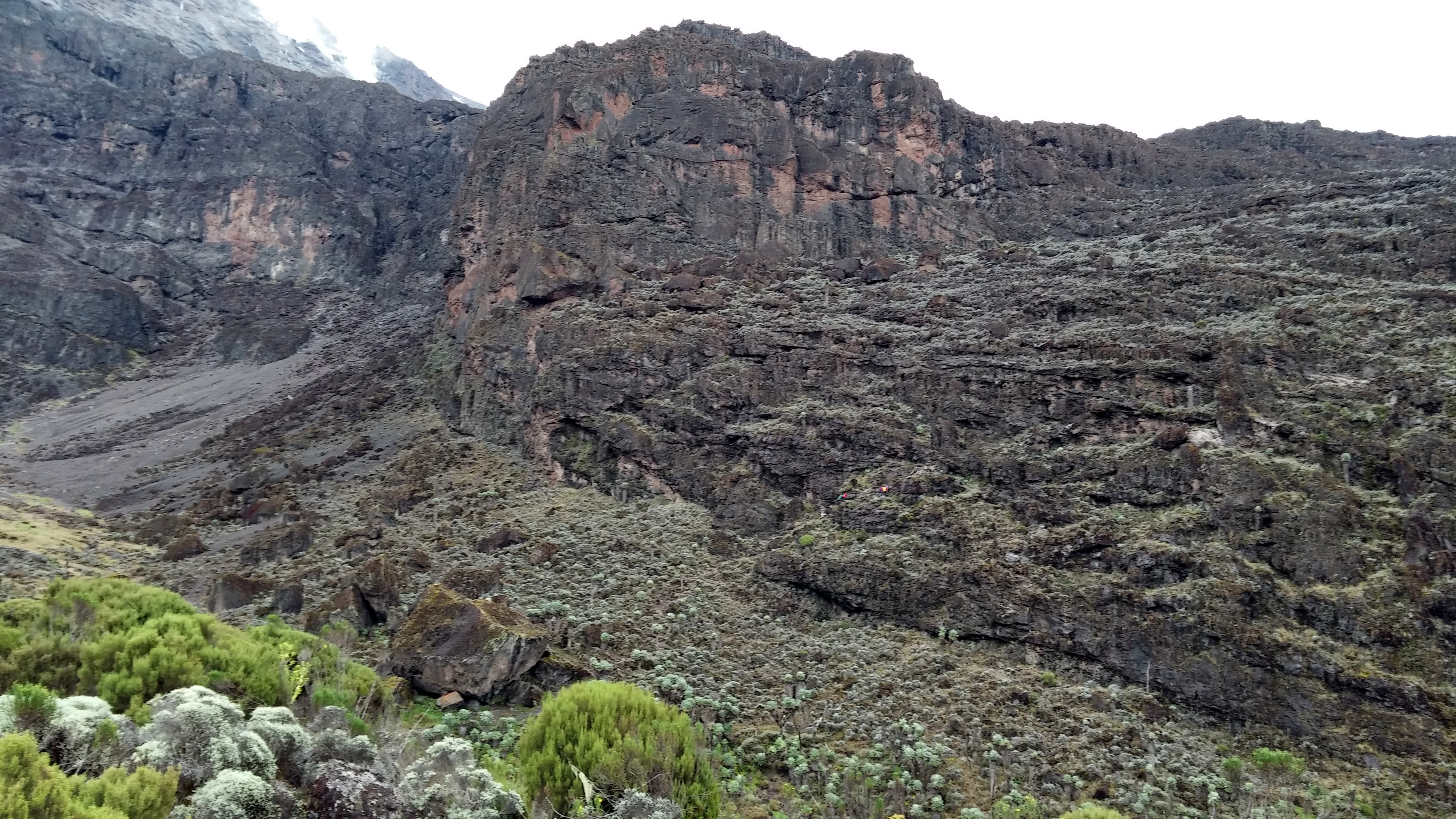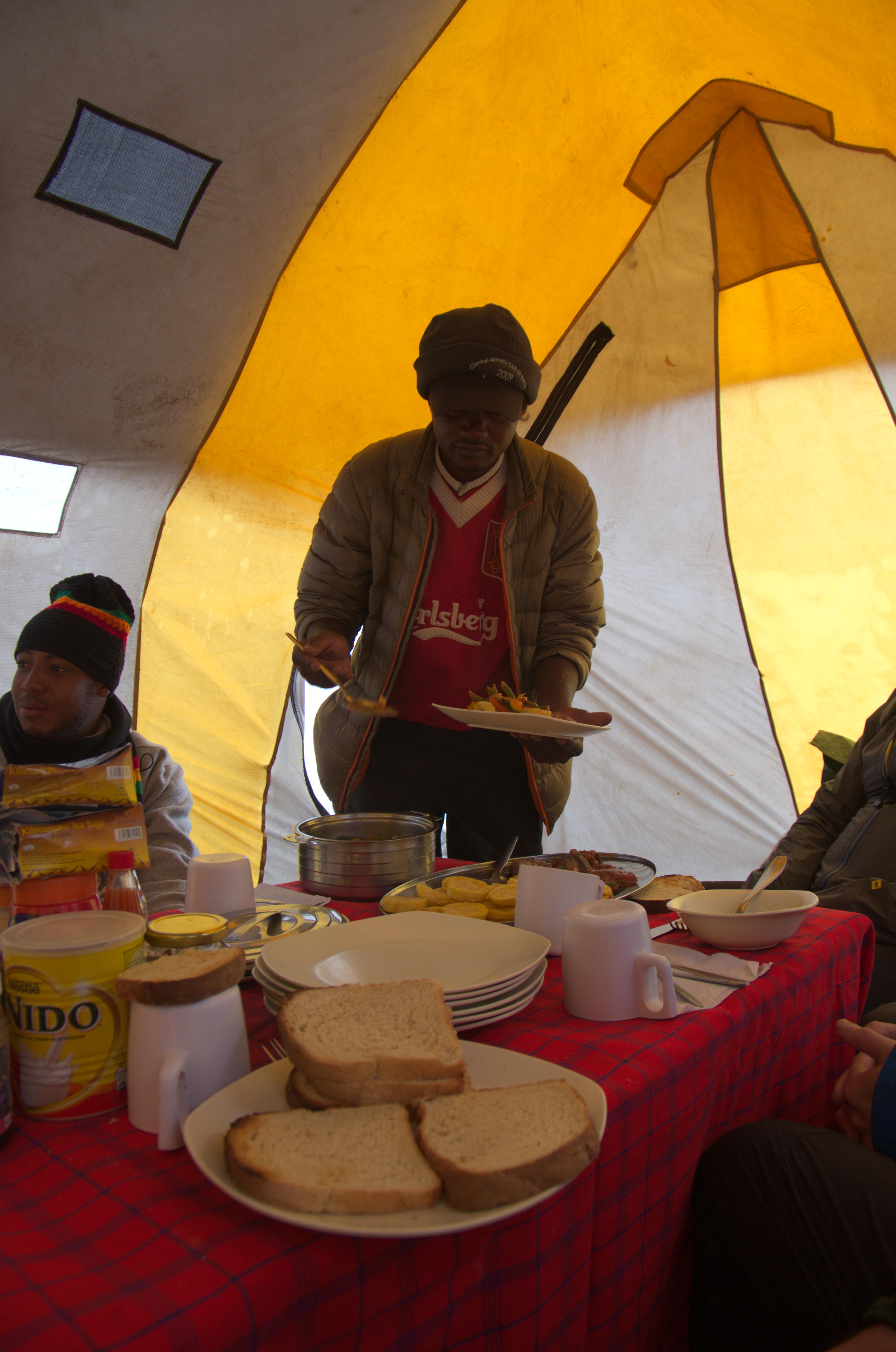 10h50: Arrivée en haut du « mur ». On retrouve les éléments classiques d’un « picnic » tanzanien. La tente mess, la tente cuisine, un repas chaud, 1 demi-diamox. Les gens ont encore de l’appétit même si certains mangent moins. Le moral est bon. On garde à l’esprit que ce soir à minuit, il faut être d’attaque pour repartir. On craint de ne pas pouvoir assez se reposer avant de partir.